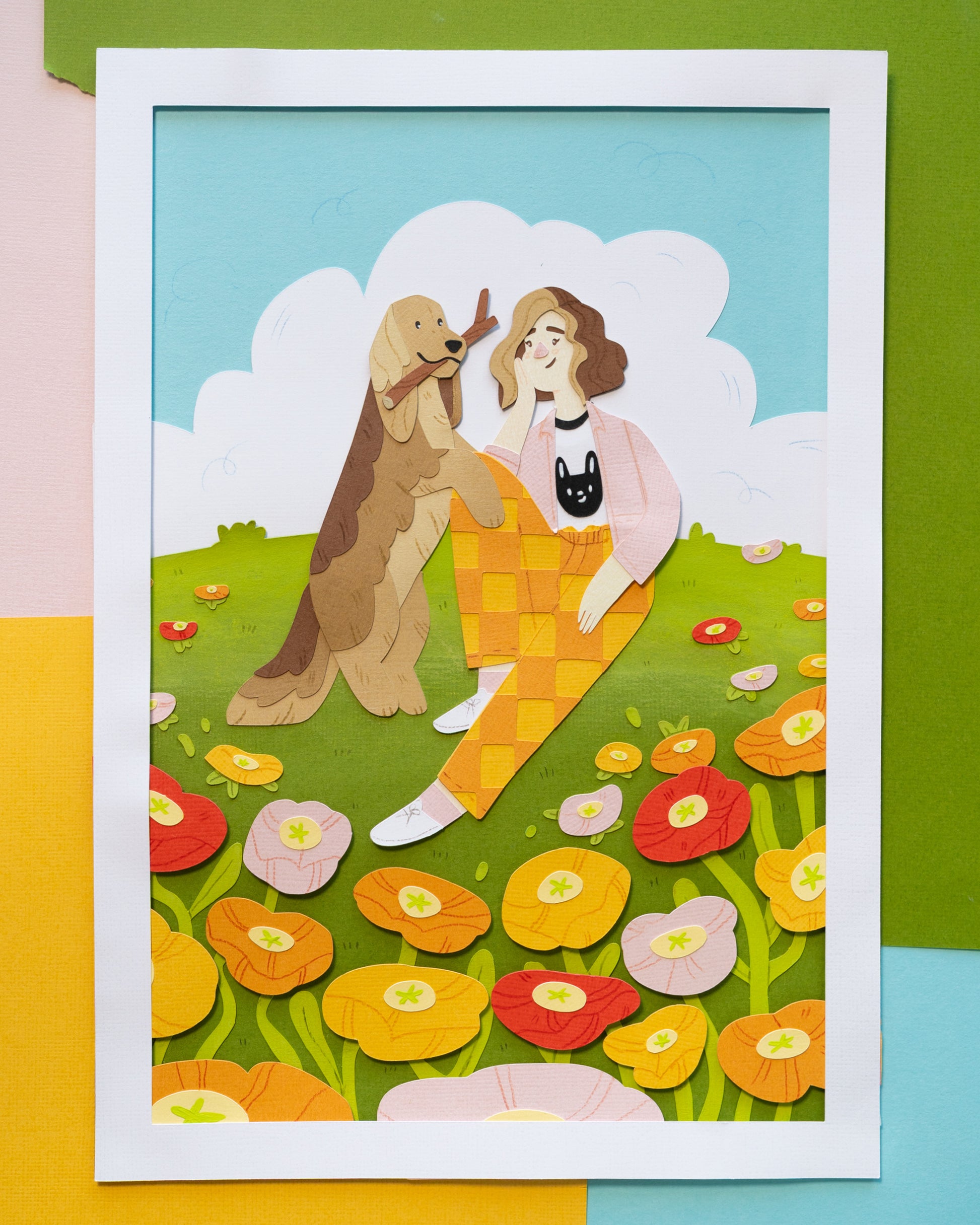 Peachtober day 5 / Poppy: Jane was sitting peacefully waiting for Poppy to finish exploring. It was so nice that the flowers had finally opened for spring. Trotting back, Poppy had something in her mouth… a not particularly unique, a little damp, and slightly stinky stick. “Oh! Is this for me? Let’s leave it here for another dog to enjoy too.”