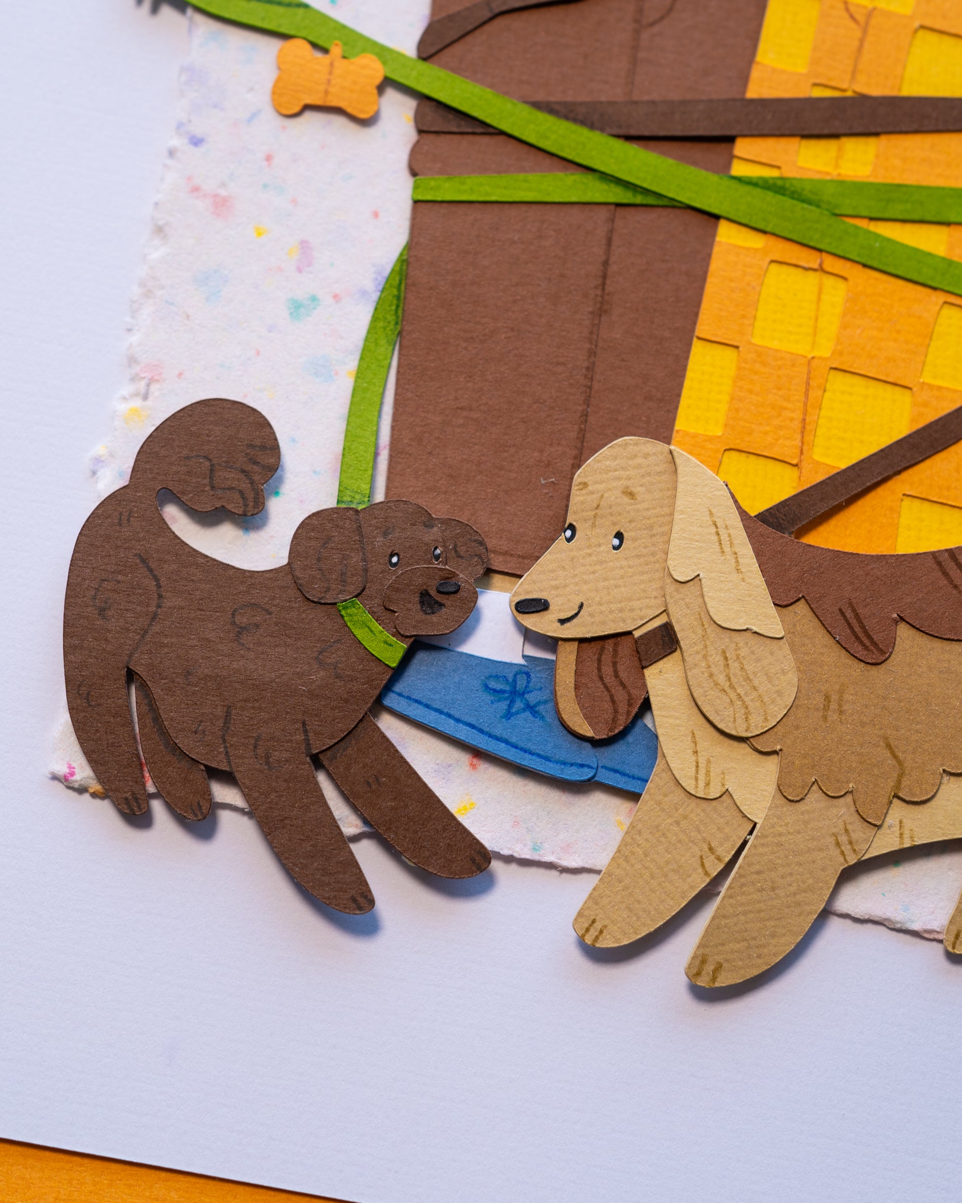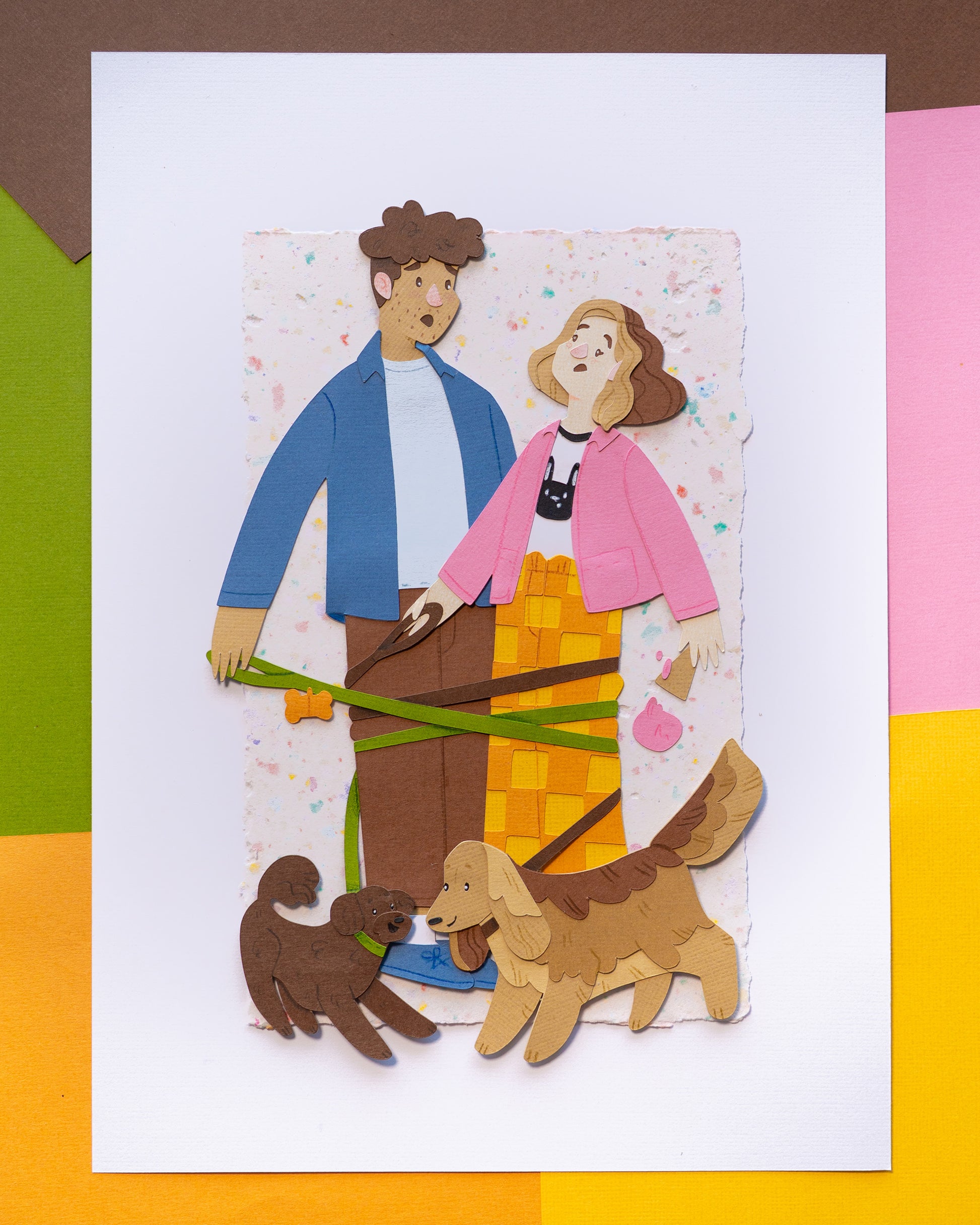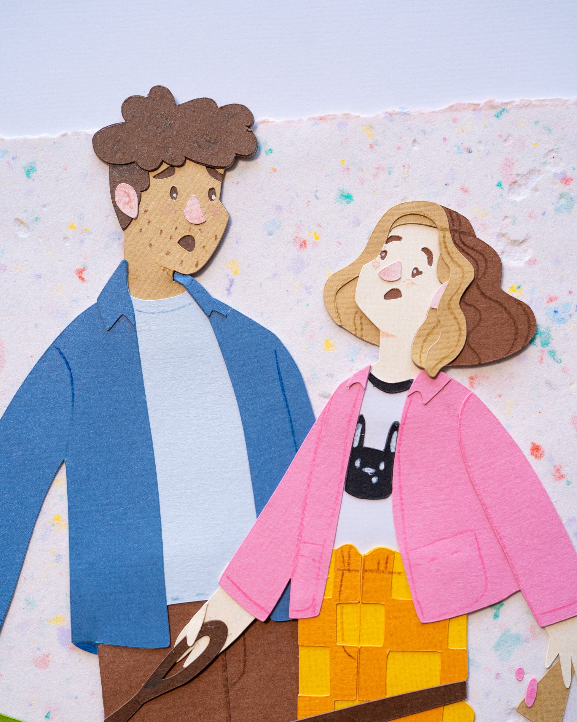 Made with archival 216gsm cardstock, handmade paper, gouache, and coloured pencils.
